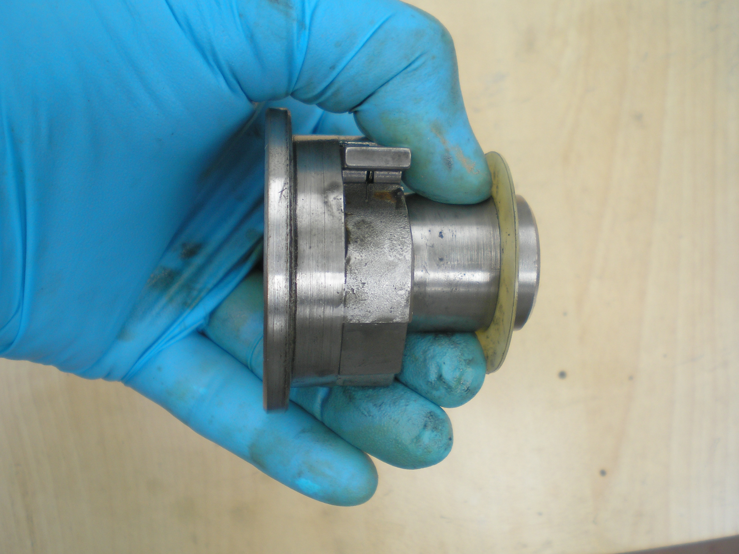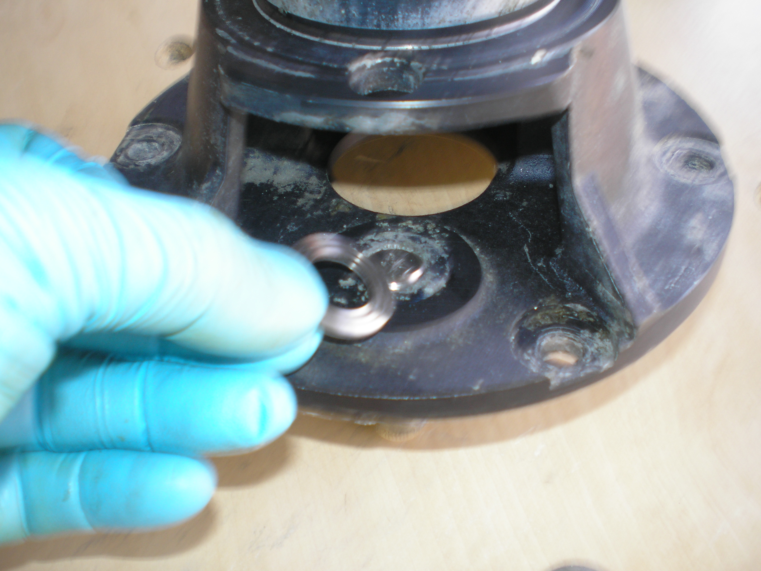 Mettiamo il grasso nella ghiera inferiore, nel perno centrale ma senza esagerare. Ci sono due rondelle per spessori, una va sotto la ghiera e l`altra sopra. Per ultimo infiliamo il perno e chiudiamo col coperchio e le viti.