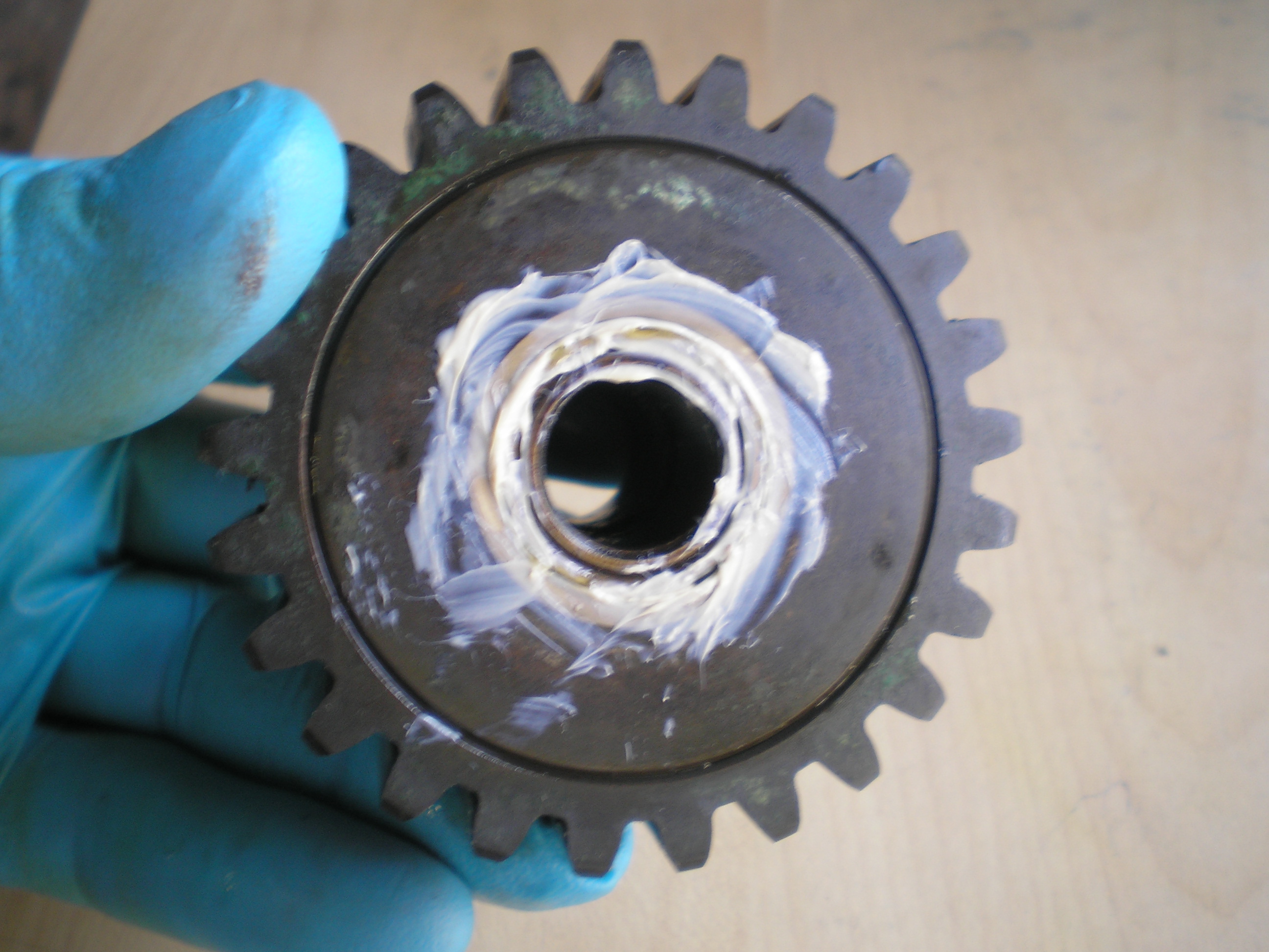 Mettiamo un po’ di grasso negli ingranaggi, prendiamo il mozzo, disponiamo la rondella inferiore, mentre quella superiore l’appoggiamo sull’ingranaggio. Dopo aver inserito il perno da sotto il mozzo, inseriamo l’ingranaggio nella sede e spingiamo il perno a fine corsa.