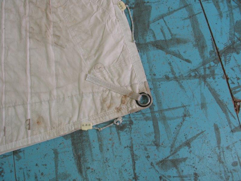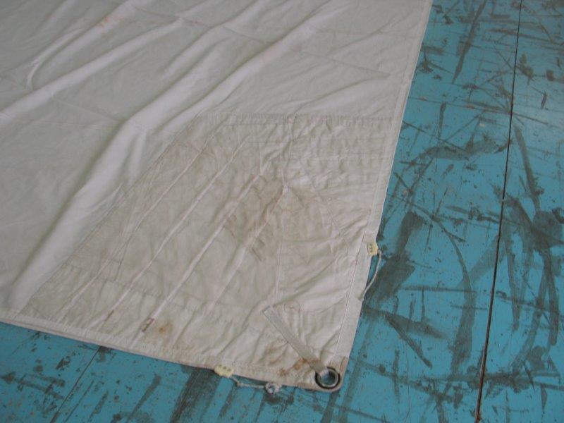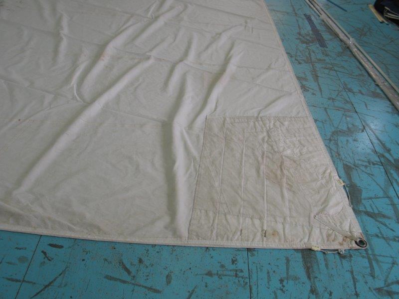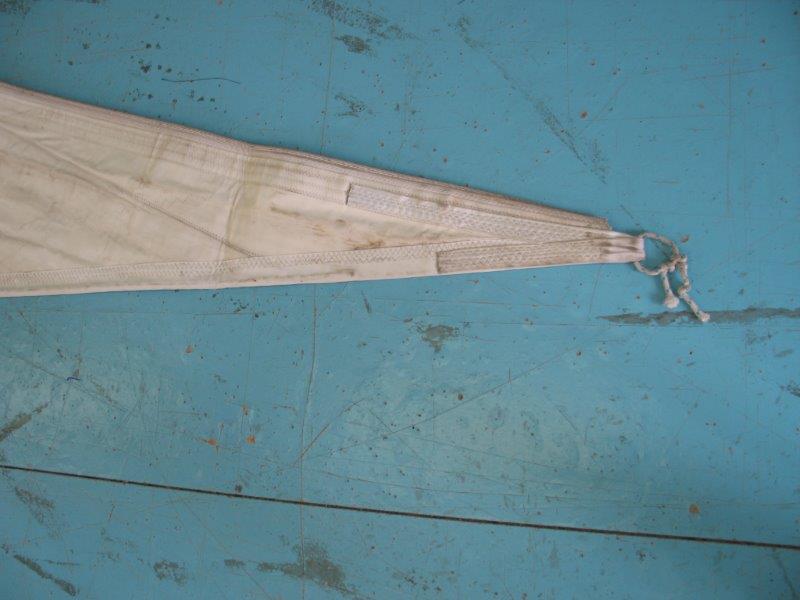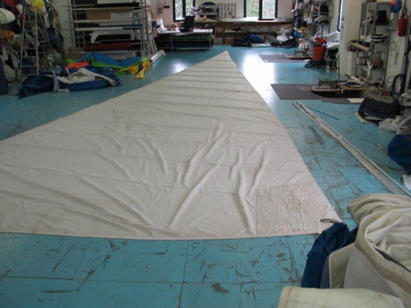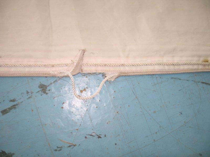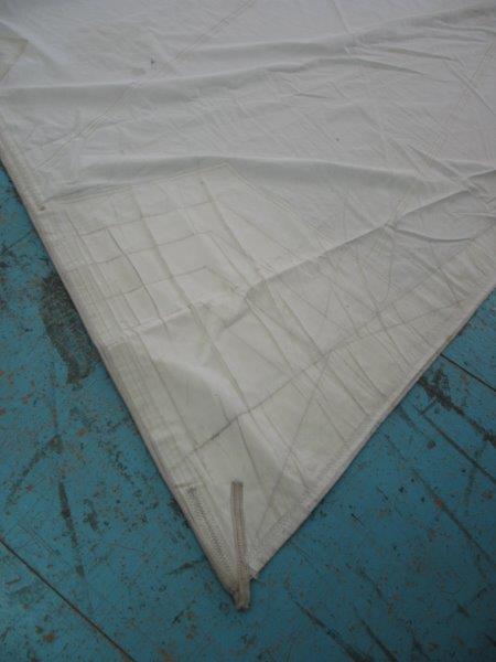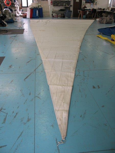 Genoa rollabile, 5/6 oz, per inferitura da 8, ralinga da rimettere in ordine in un punto (15 cm.), oppure sono da mettere gli occhielli e i garrocci; è un lavoro che si può fare a mano (senza velaio) basta avere un po' di pratica in riparazioni.