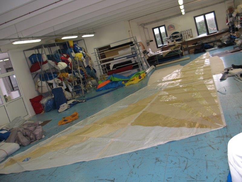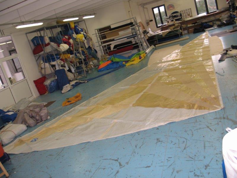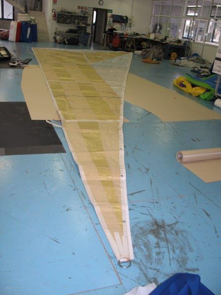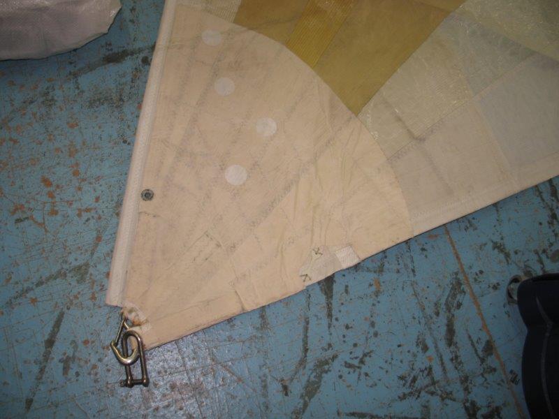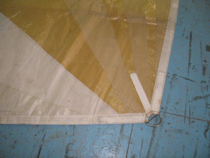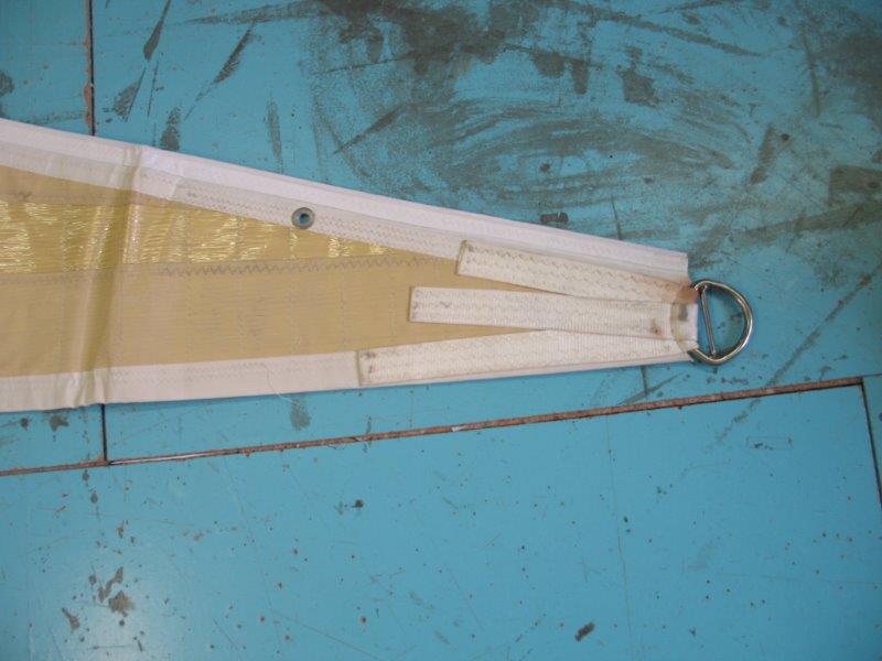 Genoa taglio triradiale, tessuto Mylar, ralinga per inferitura e occhielli per garrocci. Ha 4 sacche per le stecche, ma le stecche non ci sono. In discrete condizioni.