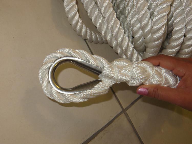 Causa errato acquisto del 18/03/2013 vendo cima 20 mm di ormeggio/ancoraggio bianca, poliestere a tre trefoli (standard) di 50 m (cinquanta metri) impiombata regola d'arte con redancia in acciaio inox 316. Carico rottura 4200 kg.